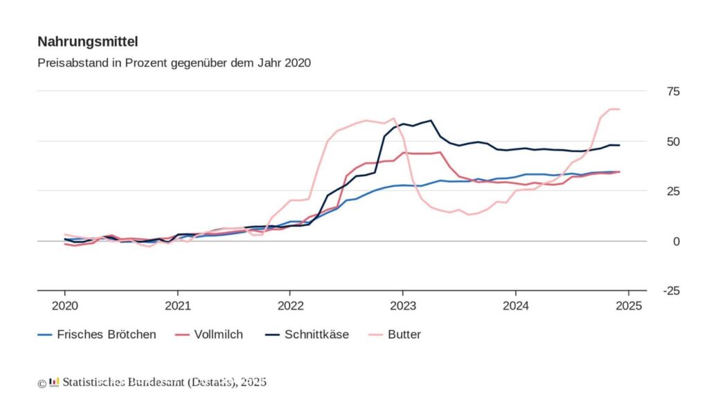 Sehen wir uns die Fakten an: Ein halbes Pfund Butter kostet heute über 3,99 Euro – ein Anstieg von mehr als 65 Prozent innerhalb von nur vier Jahren. Schnittkäse ist um 47 Prozent teurer geworden, frische Brötchen und Vollmilch um 34 Prozent. Selbst Grundhygieneartikel wie Zahncreme, Toilettenpapier und Deo haben ihre Preise drastisch erhöht.